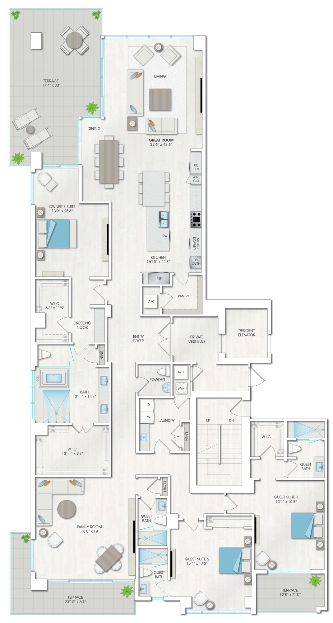 The Seabreeze is 3,753 sq. ft with 3bd/4.5 baths and a family room which can be used as a 4th bedroom. The Seabreeze run front to back and are the North and South corners of the building.The Beachwalk is a 2 bedroom plus den and 3 baths with 2,706 sq. ft of living space. It is the center condo with ocean views only. The Seaglass is the largest condo with two stories and 20 ft ceilings in the living area. It has 4,897 sq.ft of living space and there are just 4 units on the 12th,15th,17th and 19th floors. The Sandcastle is a dune level condo with 3,907 sq. ft of living space and a 2,400 sq. ft patio. If you are looking for new Singer Island oceanfront condos this is a must see building located next door to The Beachfront Singer Island. .