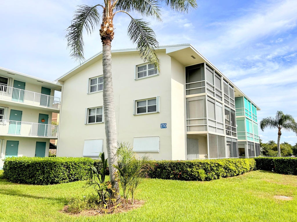 SUPER LOCATION! Cute beachy condo on second floor of popular bldg 170. By drawbridge so enjoy watching the boats right from your lanai. Security door at entrance can be left open for winter ocean breezes. Beautiful water views looking south from living room. Open kitchen, washer/dryer combo, smooth top range, built in microwave, smooth surface counters, Tiffany style ceiling light and scads of storage. Beautifully furnished including TV mounted on wall. Walk in shower with glass doors, high vanity and toilet. Bedroom has mirrored glass sliding doors on closets and California style storage inside. No carpet, completely tiled. Updated electric panel, replacement windows, accordion hurricane shutters on front and roll downs on lanai. In all concrete elevator building, steps from (see pg 2)