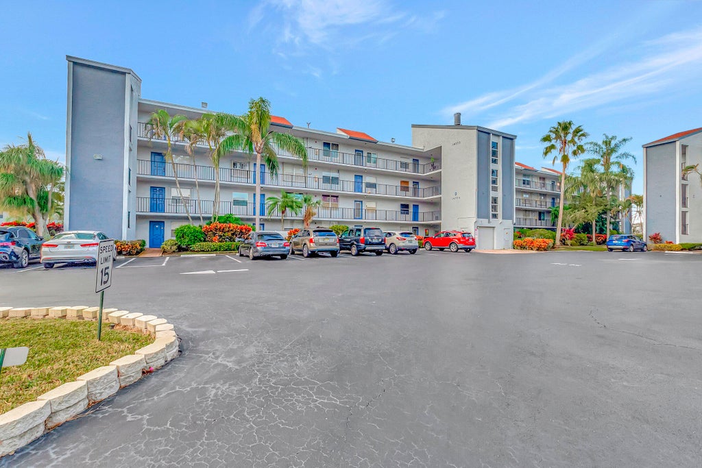 REDUCED!Monthly fees are CHEAPER THAN RENTING 2 bedroom, 2 bath condo with updated kitchen. Recessed lights, fan and stack washer & dryer.All tiled. AC 12/2019. Main suite has walk in closet, full bath with stall shower & updated vanity. Screen Patio with plexiglass sliders and storm shutters offering a lovely garden & water view. 4th floor unit in 4 story elevator building with a convenient trash chute. New Clubhouse with theatre, exercise room, card rooms, library ,pool, whirlpool, BBQ area + more in gated community. Walk to shopping, McDonalds, Dunkin Donuts, $1.00 store and so much more.