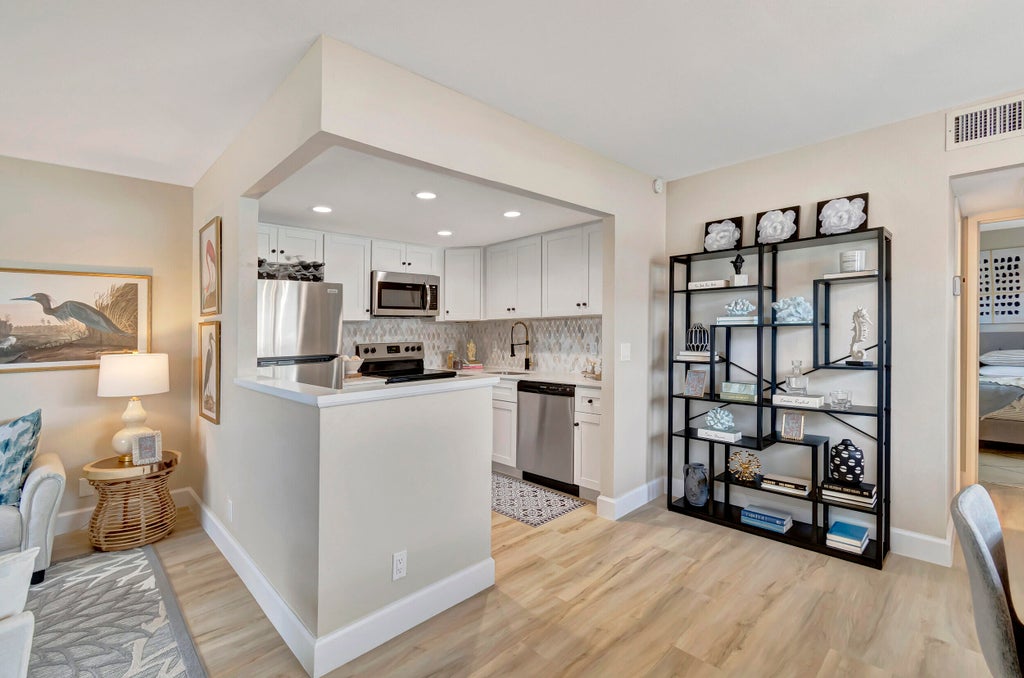 This move-in no-expense spared remodeled 1 bed 1 & a half bath Saxony J condo is the perfect fit for everyone. 2nd floor unit features a custom kitchen with quartz counters, white shaker style soft close cabinets & stunning marble backsplash make this kitchen top of the line. Luxury vinyl floor planks throughout the living space, custom bathrooms,features a walk-in shower made to suit each room Master bedroom has a direct access to the closed patio with garden views. All appliances are new including a washer & dryer with storage closet on the covered patio with tranquil views. You'll love the amenities of Kings Point including two 18-hole golf courses designed by Robert Trent Jones, Sr.; swim & tennis & exercise studio.