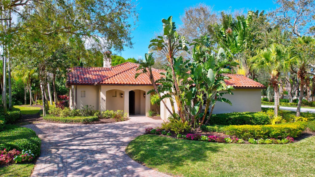 AMAZING opportunity in the prestigious Trump National Golf Club Jupiter. This custom spacious home is offered turnkey with complete designer home furnishings, fully equipped kitchen, custom bedding, draperies, plantation shutters & beach chairs in the garage. Lushly landscaped 24 hour manned gate leads to brick paver driveway. Breezeway connects detached garage & courtyard to the house. There are soaring coffered ceilings w/ thick crown molding. Traverine floors are featured in all living areas. Living room features built-in bookcases w/ stone fireplace. Ownership of this home allows new residents access to Trump National Club House, spa, pools, tennis and restaurants. The separate Purchased of a Golf Memberships allows members reciprocal play at all 18 Trump Country Clubs.