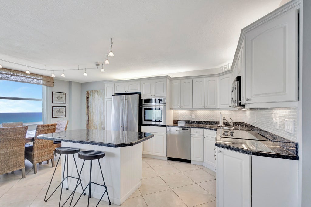 Redesigned direct oceanfront condo with stunning views of the ocean from the kitchen, dining area, and great room. A newly created parlor/den has been added for your enjoyment. The unit was decorated by a professional design team with furniture, rugs, and artwork The kitchen has beautiful pearl granite countertops with a beach glass backsplash and stainless-steel appliances including French door refrigerator and wall oven. Granite countertops, shower tile, frameless glass shower doors, and custom framed mirrors. Porcelain floor tile is throughout the condo. All windows and sliders have impact glass. ONE OF A KIND! A MUST SEE!