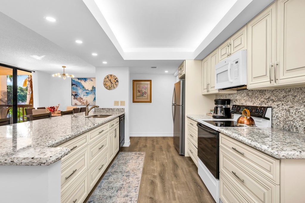 Absolutely stunning apartment that has been completely renovated with open kitchen and will all new furniture. 2 bedroom/2 bath on the 2nd floor. Lakefront unit with sweeping lake and bridge view and next to the pool. Tile flooring throughout. Split floor plan for more privacy and space. Screened patio area, In unit laundry room with washer and dryer, Secured building entry. A newly renovated fitness room and 2 resort style pools and jacuzzi. Just look at the pictures. Internet wifi, cable and water included. Walking distance to stores and restaurants: wholefood, Target, etc... a little over 1 mile to the beach.