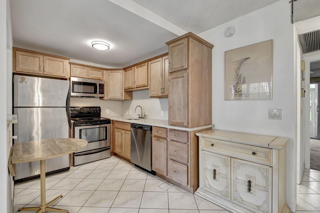 This beautiful condo is in the highly sought-after Century Village Active Adult Community. The unit is on the GROUND FLOOR and offers a lovely garden view. The central air conditioning was installed in 2019, and the water heater was replaced in 2021, ensuring maximum comfort. The kitchen has been renovated with quartz countertops, stainless steel appliances, and real wood cabinets. The bedroom provides ample closet space, carpeting, and a partially renovated en-suite bathroom with a marble countertop vanity and step-down shower. The screened-in patio has roll-down storm shutters and additional storage space, providing plenty of room for seating, dining, and entertaining. The building's convenient location allows for a 10-15 minute walk to places of worship