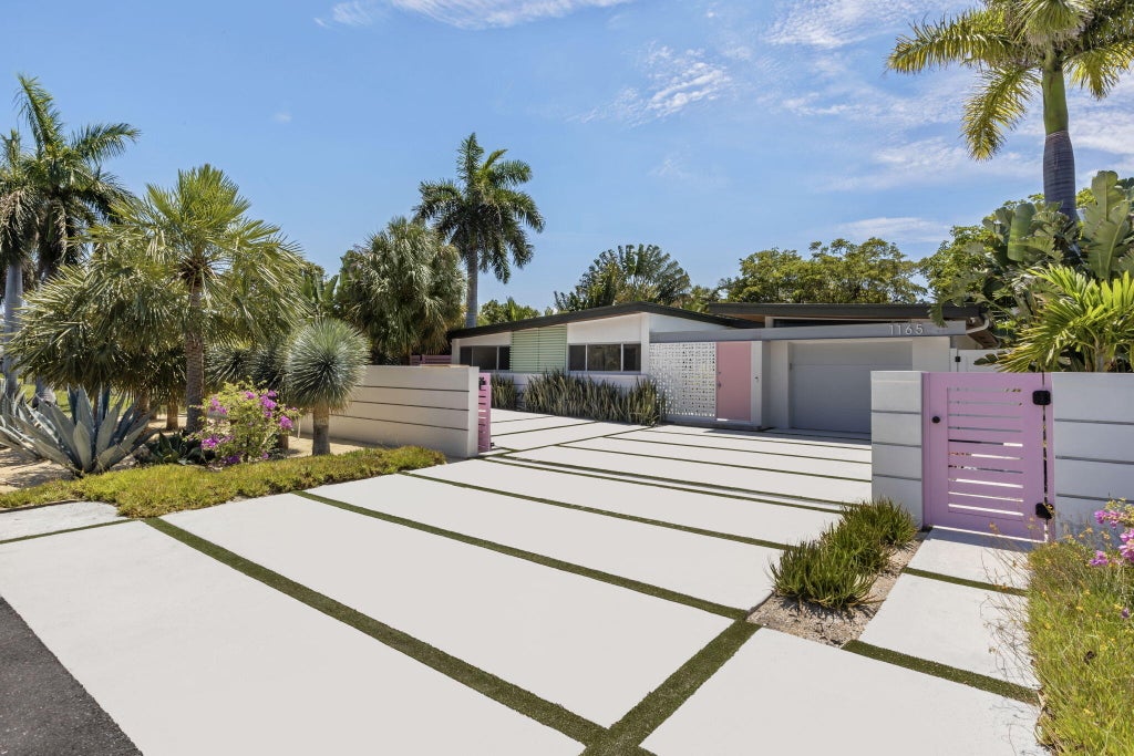 Welcome home to mid-century modern masterpiece in Boca Raton. Nestled in the prestigious Golden Triangle, Boca Raton's premier neighborhood, this residence epitomizes the vibrant lifestyle of East Boca. Experience luxury living in this 3-bedroom, 3-bathroom mid-century modern masterpiece, freshly completed and boasting a wealth of high-end upgrades. The home features a new garage, roof, whole-house generator, AC, tankless water heater, and updated plumbing and electrical systems, all completed in 2022. Upon entering, you'll be captivated by walls of impact glass that provide stunning views of the lush backyard oasis. The outdoor space is a tropical paradise with an oversized heated pool and spa, surrounded by vibrant greenery and playful pink and mint accents.