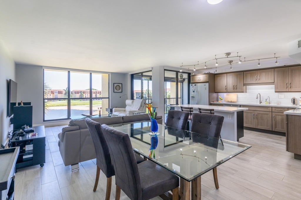 Welcome to the fabulous & updated 2-bedroom, 2-bath condo in the beautiful, oak tree lined streets of the Woodland Lakes, 55+ community. This Condo Features an Open Floor Plan with ALL Impact Glass, Ceramic Tile Flooring in ALL rooms, Custom Solid Wood Doors, Electric Shades in ALL rooms, brand new roof (July 2024), new elevator, all concrete restoration complete, complying with all new Florida codes, and the Most Magnificent Lake Views from Every Room. The Eat-in Kitchen features a Large Island with Quartz Counters, Neutral Custom Soft Self Close Cabinetry, Beautiful Glass Subway Tile Backsplash, Stainless Steel Appliances, Custom Track Lighting and Bright LED under-counter lighting illuminating your entire cooking and counter surfaces. One year old Hurricane Rated, Impact Sliding