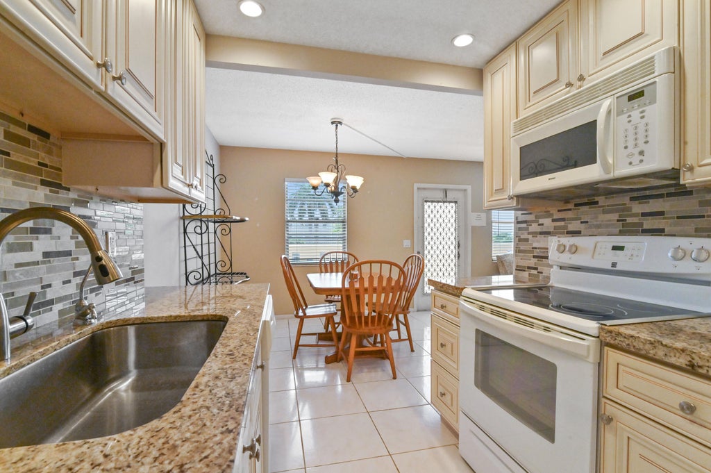 CENTURY VILLAGE, BOCA RATON--SUPER ACTIVE ADULT COMMUNITY. We're excited to present a bright, spacious, 2/1.5 condo by the lake in a highly sought-after area now on the market.The kitchen, living, and dining room areas feature stunning tiles.The recently renovated kitchen is gorgeous and spacious, with quartz countertops, a glass backsplash, beautiful natural wood cabinets, white appliances, and an oversized sink. The master bedroom has carpeting, a large walk-in closet, and sliders leading to the patio, which offers a stunning view of the lake.The fully renovated bathroom boasts a beautiful shower stall and an attractive vanity.The guest bedroom also includes carpeting, a spacious closet, and a large window for natural light.