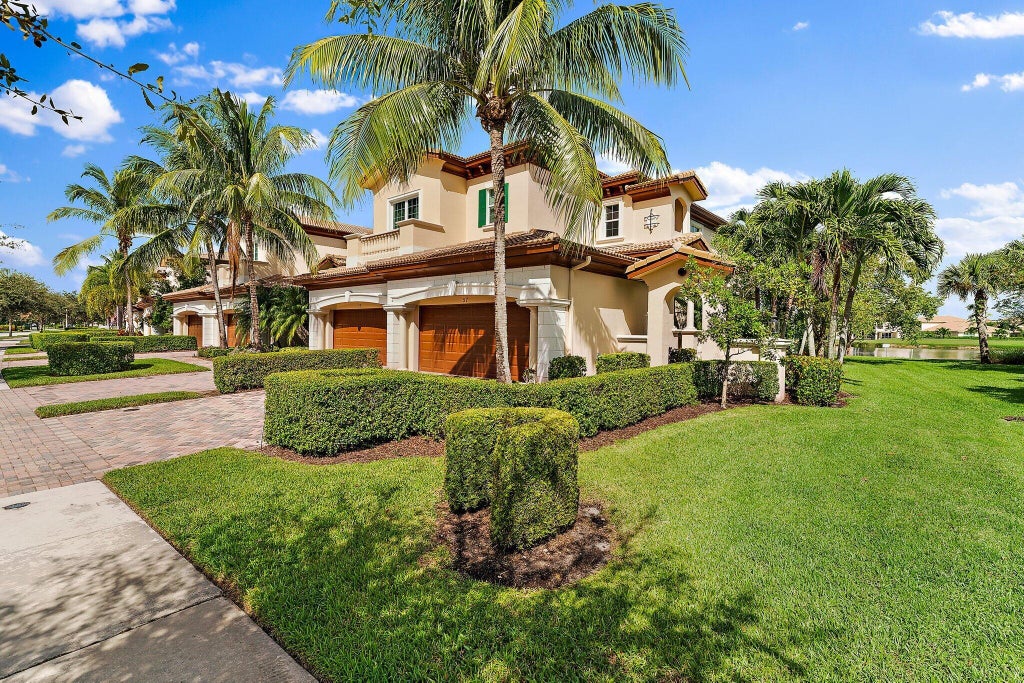 Gorgeous end unit overlooking a lake in Jupiter Country Club. Spacious, light and bright townhome with 3 bedrooms, 3 baths and a full den/office. Private elevator leading to the main living area. Over 2650 sq ft of living space, the home boasts an open chef's kitchen with gas range, granite countertops and stainless appliances. Extended covered lanai from both the kitchen and the master bedroom peacefully overlooking the water. Perfect for either a full time or seasonal resident. Minutes to the ocean and the beautiful beaches of Jupiter, restaurants, shopping and airport.
