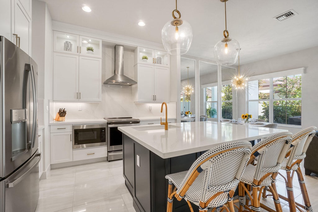 Discover contemporary luxury in this 2021-built, 3-bedroom, 2.5-bathroom townhome with a loft/office and a 2-car garage. Move in Ready and Ideally located minutes from upscale shopping, pristine beaches, and PBIA airport, this home is designed for comfort and style. Enjoy an open floor plan with abundant natural light, 24-inch polished tile, and custom remote blackout shades. The gourmet kitchen features white shaker cabinets, gold hardware, ceiling-high displays, an induction stove, and a spacious island perfect for entertaining. The dining room shines with a statement chandelier and mirrored wall, while the living area includes a built-in California Closet unit for a sleek finish. The serene primary suite boasts upgraded carpet, a designer closet, and a spa-like bathroom with