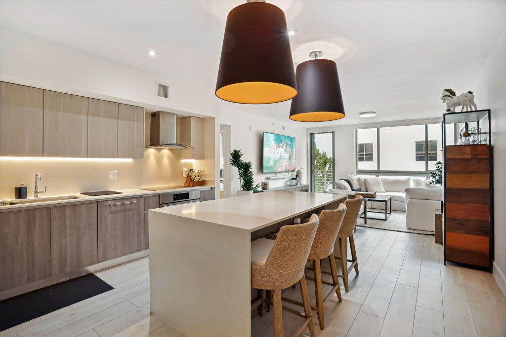 Welcome to 111 First, where modern luxury living meets the heart of Downtown Delray. This exquisite 2-bedroom, 2-bath corner condo with a wrap-around terrace showcases designer finishes throughout. Entertain effortlessly in the spacious, contemporary kitchen boasting high-end cabinetry, a large waterfall island, quartz countertops, and built-in Bosch appliances. Additional upgrades include porcelain wood-like tile flooring, electric shades, custom shelving in closets and the laundry room, a Nest thermostat, and an August lock for secure entry. Indulge in your morning coffee or unwind with an evening cocktail on your private terrace.