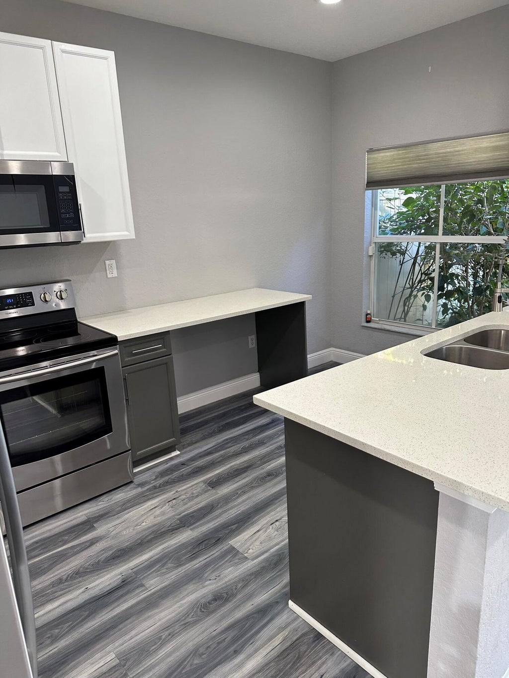 A Beautiful 3/2.5 townhome with private patio & small rear yard. Completely updated, all new vinyl flooring throughout. Spacious large eat-in kitchen with Stainless Appliances, Custom Cabinetry, pantry, recessed high hat lighting & breakfast bar. Washer/dryer in unit. Walk in closets in Primary & 2nd BR, plus additional storage under steps. Living room, separate formal dining area, family room, snack bar & eat-in kitchen. Secure Gated community on S. Congress between Lake Ida & Woolbright. Convenient access to beaches, I-95, Turnpike, Atlantic Avenue. Close to schools. Community pool, tot lot & Assigned parking spot at your door. Must see