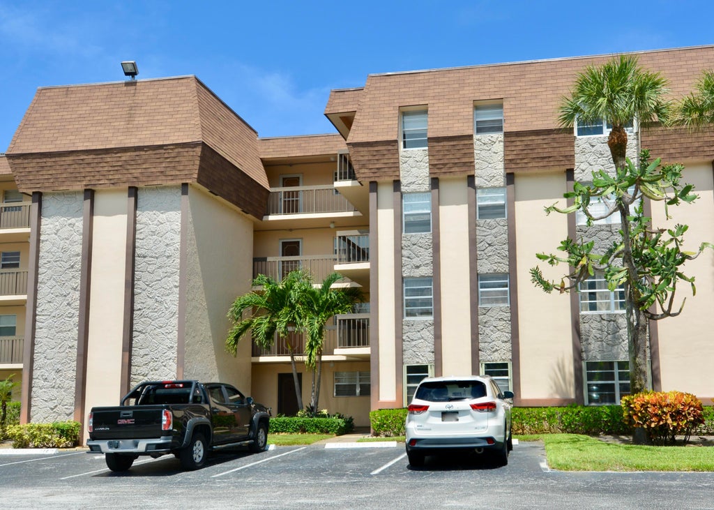 Beautiful bright open condo on first floor pet friendly 2 bedroom 2 bath with den that can be converted to 3 bedroom. Screened patio overlooking garden with storm shutters. Den window has impact glass. Laundry inside. All tile floors. New refrigerator and dishwasher. Kitchen granite countertops. Extra built in cupboards and bookshelves in eat-in kitchen. Window treatments including plantation shutters in den and bedroom 2. Partially furnished. Assigned parking space. Near beaches, Publix, WholeFoods, Trader Joses, Fresh Market and several restaurants. Maintenance covers community landscaping, building insurance, community pool, trash, basic cable and Internet. All room sizes are approximate and should be verified by Buyer.