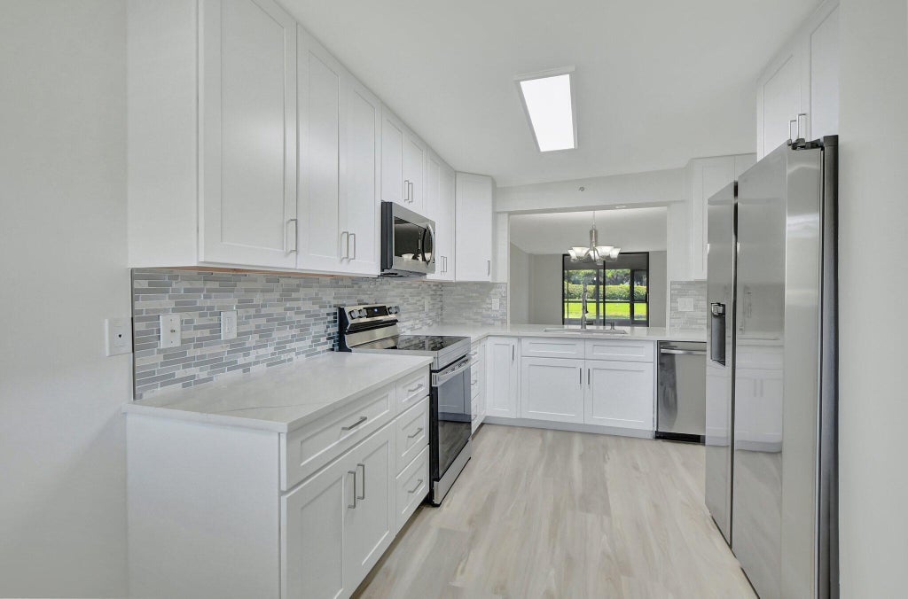 You'll love this spacious lakefront condo. It has been totally remodeled so you don't have to do anything but enjoy it. It boasts new white shaker cabinets,, white quartzite countertops. New white bathrooms, new a/c, and w/h. Beautiful new laminate flooring, new lighting and more. This popular gated 55+ community even has courtesy bus service. The community is friendly and welcoming. It offers many clubs, and activities, There are active pickleball and tennis groups.. Lakes of Delray is located near good restaurants and shopping. It is near I 95 and the turnpike and is just minutes from the beach.