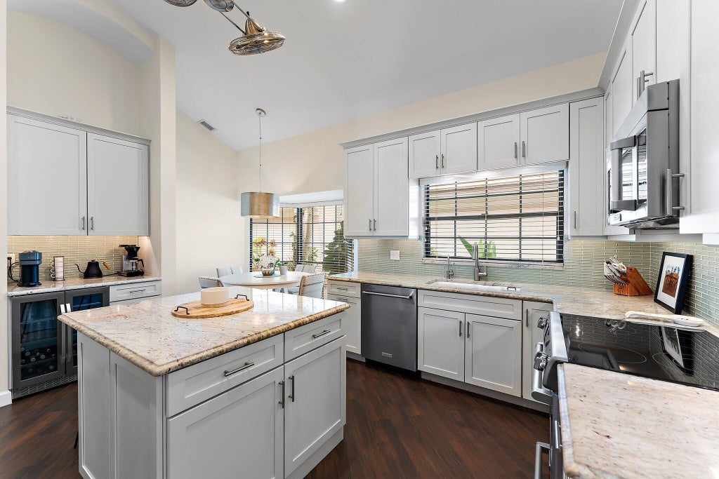 Experience tranquility in this completely renovated single-level home in beautiful Coventry, in PGA National. This serene residence offers two bedrooms, two and a half bathrooms, plus a den with a new California Closets Murphy bed, easily transforming it into a third bedroom. Situated on a corner lot, the home is surrounded by lush landscaping and calming tropical plants. The luxury kitchen features granite countertops, KitchenAid professional series appliances, a glass tile backsplash, custom-paneled refrigerator, brand new dishwasher, a coffee nook area with beverage fridge, and eat-in dining. Elegant 24 x 24 travertine marble and wood floors flow through the main living areas and bedrooms, enhancing the home's neutral and light-filled atomosphere. The primary en-suite spa-like bathroom