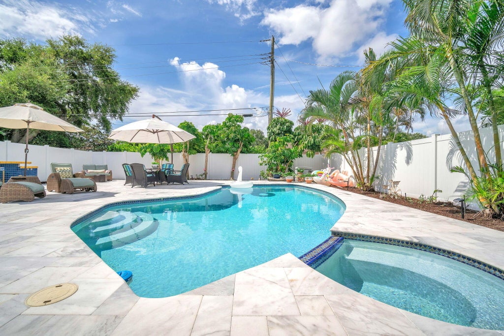 Enchanting East Boca Raton Retreat! Bienvenue to this charming East Boca Raton home featuring 3 bedrooms, 2 bathrooms, a cozy den, and a one-car garage. The warm and inviting kitchen and living/dining area seamlessly blend with the picturesque patio and sparkling pool, where many elegant soirees and joyful gatherings have taken place. A lovely and inviting front yard, along with a new fence, adds to the home's allure. Modern conveniences include a gas hot water heater, gas stove, gas dryer, and a new washer from 2023. Enjoy the freedom of no HOA, while being conveniently located near Downtown Boca, Mizner Park, the Brightline, the stunning Boca Raton beaches. Experience the art of living well in this delightful East Boca haven.