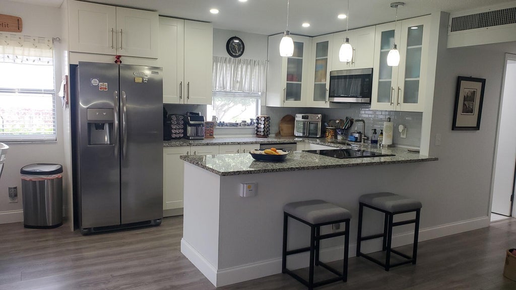 Charming and updated two bedroom. 2 full bath, 1 story villa in desirable Kings Point Golf & Country Club. This home has been completely updated with a modern open kitchen, white cabinets, granite counter tops, and stainless appliances. There is laminate flooring throughout, no popcorn ceilings, updated lighting, baseboards, and fans. New permitted impact front door with built in blinds. Beautiful lake view from the living room window. AC was replaced in 2021.Home comes unfurnished.
