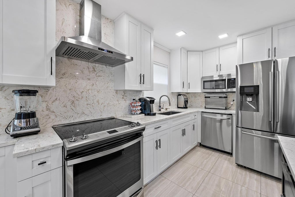 Newly updated and meticulously maintained, this 2-bedroom, 2-bathroom condo offers the epitome of resort-style living. Step inside to an open layout, designed for easy movement from room to room. The kitchen features updated cabinetry, new light fixtures, quartz countertops, a stainless steel appliance package, and a spacious waterfall island--perfect for food preparation and entertaining family or friends.Both bathrooms have been beautifully remodeled with walk-in showers for easy access. The condo also boasts newly installed contemporary oversized tile floors. The lanai includes an extra refrigerator for added storage, making grocery trips less frequent.