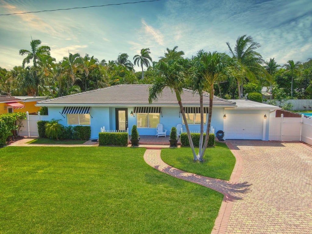 Magnificent Beach House in the prestigious Boca Riviera Island community. This spacious, one-level home boasts 3 bedrooms, 2 bathrooms, and a private pool, The home features IMPACT windows, elegant wood floors, and custom closets. The heart of the home is the stunning open kitchen, complete with gleaming marble countertops, high-end stainless steel appliances, and a convenient 4-seat breakfast bar for family gatherings. Step outside to your private tropical oasis, where a sparkling pool awaits, enhanced by a custom cabana area designed for ultimate relaxation and entertainment, featuring a summer kitchen, ample seating for 8, cypress wood ceiling details, granite countertops, and dual SS grills.Evenings are illuminated by custom landscaping lighting, creating a captivating ambiance.
