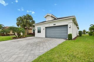This elegant and meticulously maintained 3-bedroom, 3-bathroom home with a 2-car garage is situated in the prestigious Valencia Bay, a 55+ community. Boasting an impressive 2,900 sq. ft. of living space, the residence features over $200,000 in premium upgrades. The bright, open, split floor plan is designed for modern living, offering both style and functionality. The home includes a versatile en-suite with a hobby room or office option, making it ideal for personalized use.The property showcases high-quality finishes throughout, including impact glass windows, double etched glass entry doors, and extensive use of large light neutral porcelain tile. The upgraded motorized solar window treatments, custom-fitted closets, and plantation shutters add to the home's luxurious feel.