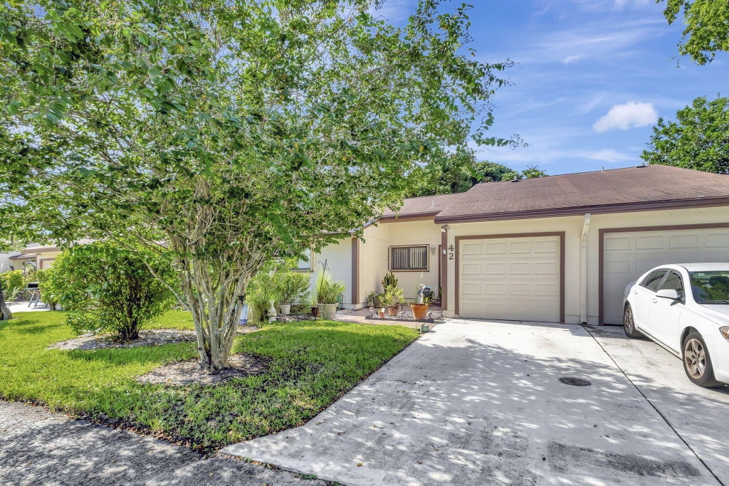 Discover your serene retreat in the heart of Boynton Beach with this immaculate 2-bedroom, 2-bathroom villa, complete with a 1-car garage and nestled in a tranquil cul-de-sac. This home features is updated vanities, fixtures, and lighting in both bathrooms, a 2019 A/C and new flooring in the guest bathroom. Enjoy peace of mind with accordion shutters on all windows and sliding doors, plus a transferrable security system. Step into the serene backyard with a screened porch, perfect for relaxing and enjoying peaceful moments surrounded by lush greenery. Experience resort-style living with access to a community pool, clubhouse, and tennis/pickleball courts, offering endless recreation and social opportunities.Maintenance covers cable, internet, lawn care, and upkeep of common areas