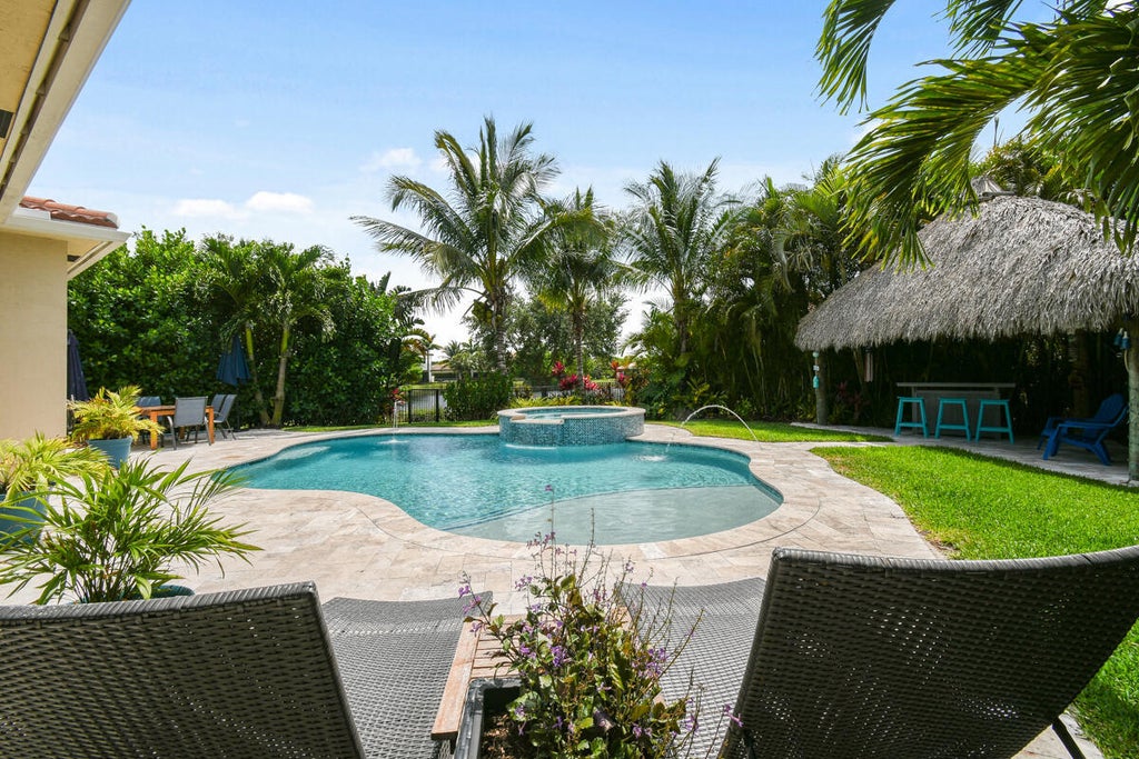 This delightful one story 4/2.5 offers the finest in luxury comfort & style. Impact glass windows & doors, a split floor plan, open modern kitchen with center isle and pendant lights. Tile throughout, plantation shutters are only a few of the highlights. Tropical backyard complete with custom design pool & spa plus a Tiki hut. Perfect home for entertaining of family time.