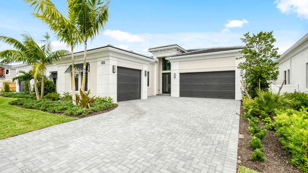 **New Construction - Move In Ready** This brand new Michaelangelo floorplan is situated on an interior waterfront homesite within Artistry Palm Beach. This home offers 3 bedroom suites, each with their own bathroom, an additional half bathroom and a 2 car garage. This Michaelangelo also includes gas cooking in the kitchen, 2nd tier upper cabinets, quartz backsplash, waterfall quartz kitchen island and under cabinet LED lighting. The house has an expanded owners walk in closet, double doors added to the den, and a gas connection for a future pool heater as well as gas, electric and water connection for an outdoor summer kitchen. One of the last opportunities for new construction in the heart of Palm Beach Gardens, the community of Artistry Palm Beach offers a 24/7 manned-gated entry and