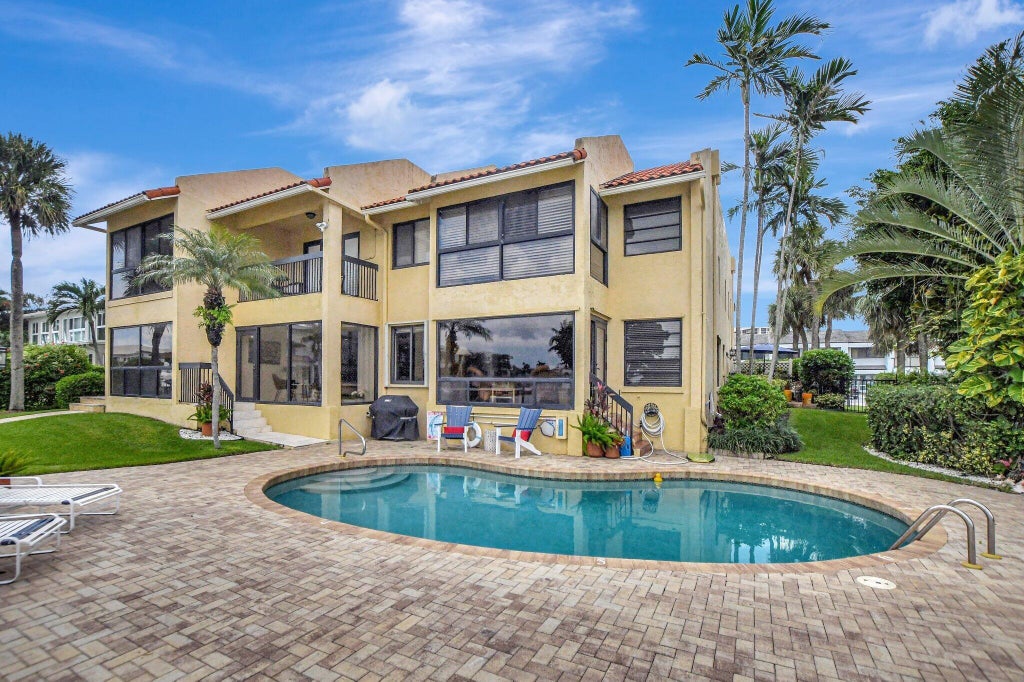 Welcome to Waterfront Paradise, a stunning Mediterranean Modern style 3 bedroom (3rd is loft), 2 1/2 bathroom townhome steps from the beach. Immaculately renovated with premium materials, this home offers a unique resort-style backyard, a semi-private pool shared with only two other townhomes, 25 feet of dockage with electric, and private beach access. Every detail has been carefully curated with top-quality craftsmanship.The spacious living and dining areas are perfect for holidays and gatherings, featuring large windows and sliding glass doors that open to your outdoor oasis. The gourmet kitchen, recently updated, boasts marbled granite countertops, a large island with ample seating, a generous pantry, and high-end stainless steel appliances to inspire your inner chef.