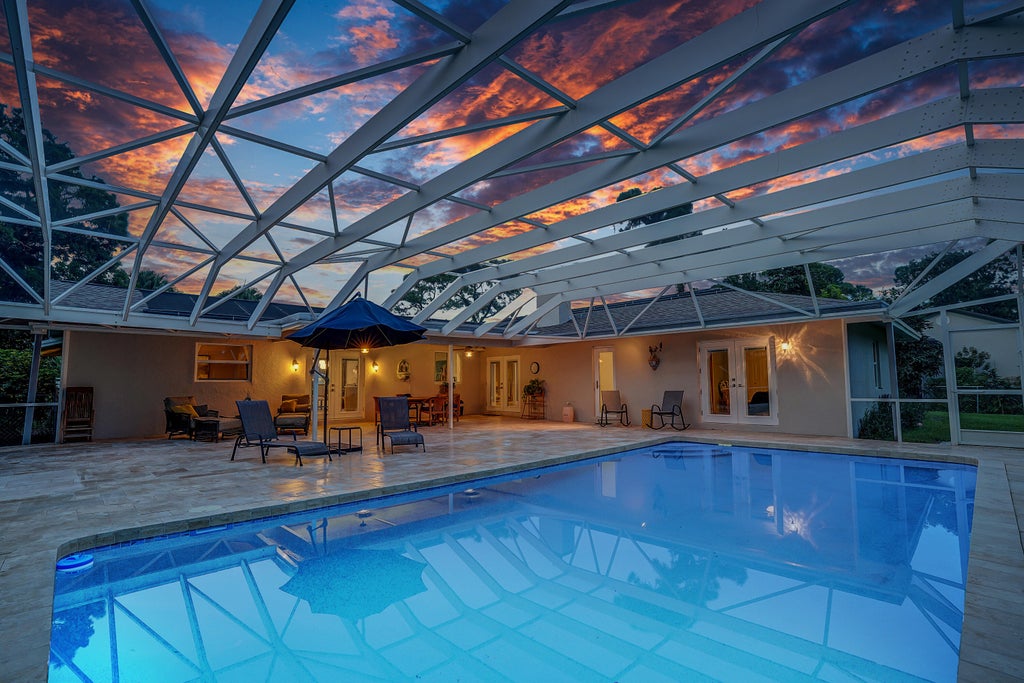 RARE! 4 Bed, 3 Bath, CBS pool home w/ New Roof '20 & Impact Glass, on .5 acres in Eagle's Nest w/ private boat ramp on the Lox. River 3 miles from the Jupiter inlet. An open, split floor plan awaits which includes kitchen, dining & bar area w/ seating for 5 at an 11' quartz island w/ storage, SS appliances & matching bar with bev. cooler, and room for a dining table that can seat 12. Adjacent, a spacious living room w/fireplace & French doors to the massive screened & covered patio & pool area (45x55) served by a full cabana bath. Next, 3 guest bedrooms, 1, an en-suite w/ French doors to pool, while the main bedroom is spacious w/ 2 walk-in and 1 standard closet, 2x vanities, glass shower and whirlpool tub. Last, Laundry Room, 2 car garage & 14x40 boat/rv parking, LOW HOA, A-Rated Schools