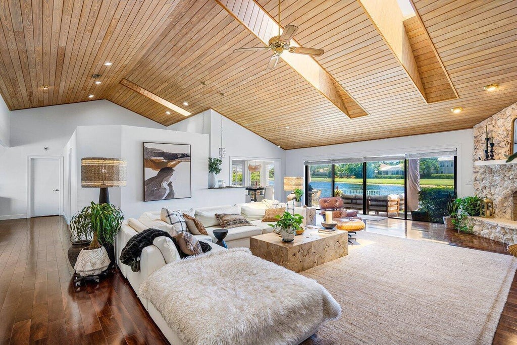 Discover luxury living in this expansive 3BR, 3BA home nestled in the prestigious Marlwood Estates of PGA National. Spanning over 3,000 sq ft, this residence welcomes you with soaring 15 ft tongue and groove ceilings & elegant hardwood floors. Every room offers breathtaking lake & golf course views. Completely open floor plan, with plenty of space for entertaining. Kitchen complete white cabinetry, granite countertops, newer Samsung refrigerator and Kitchenaid Dishwasher. Family room features tons of natural light via perfectly situated skylights and working cortina stone fireplace. Primary suite complete with his & her walk-in closets, dual vanities, and separate tub & shower. Designated office space located right off of the primary bedroom.