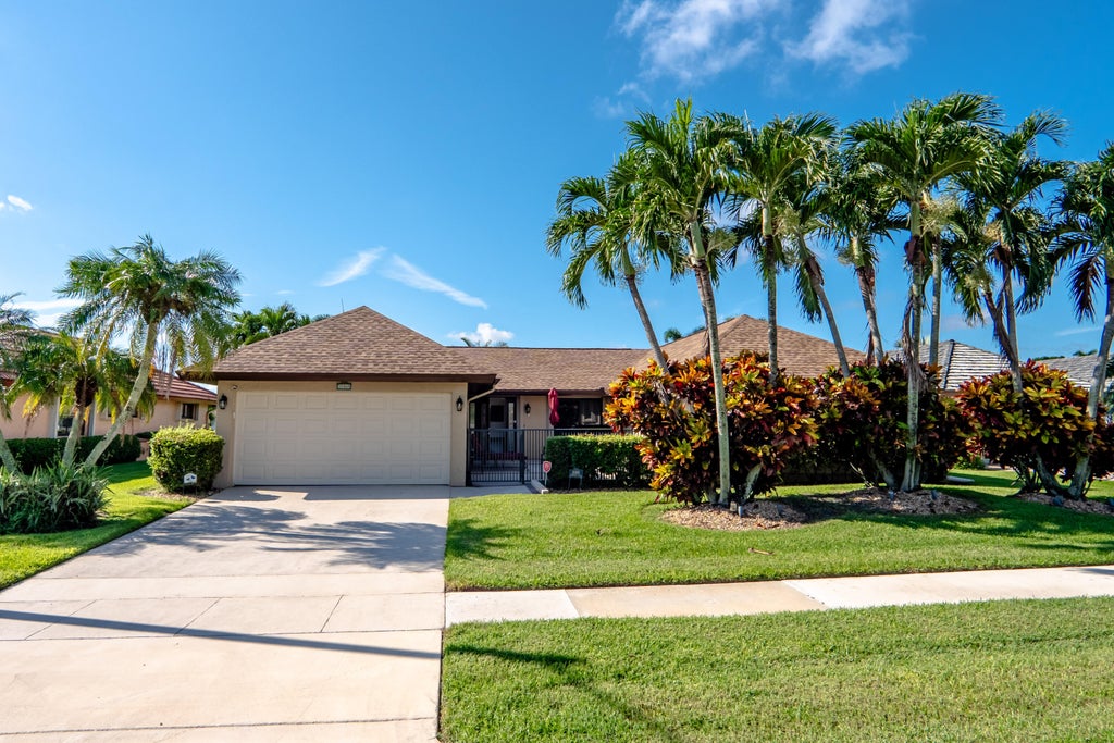 Renovated Ranch with updated kitchen, new roof, open floor plan, sliders lead into yard with tons of green of space. 2 car garage, adorable front patio space, canal waters the lawn. alarm system. new hurricane shutters, new baths & AC has a new fan. Heated pool, clubhouse and tennis courts.