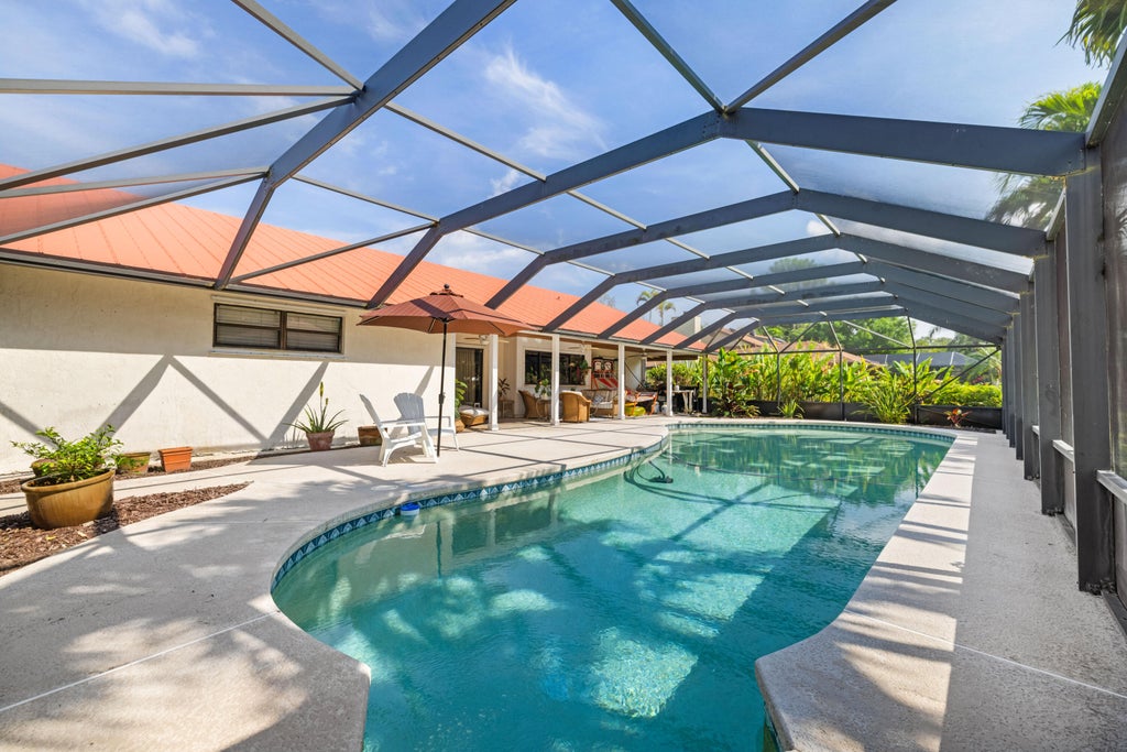 The gated community of Coral Lakes offers this 1/2 acre lot nestled right on the lake with lush vegetation, an outdoor entertaining dream. This CBS construction home with a metal roof has 3 bedrooms 2 baths with a 2 car garage. Hardwood cabinets and stainless appliances with a pass though window from kitchen to outdoor bar. Updated bathrooms and new vinyl flooring in the bedrooms. Step out to the covered patio with a large screen enclosed pool. Or for the outdoor lovers, enjoy nature under your pergola with a koi pond, waterfall, fire pit and lake views. Peaceful is an understatement! Newer AC also. The community has low HOA dues, and is beautifully maintained with the security of a gate for privacy, Boat and RV Storage on site with a waiting list.