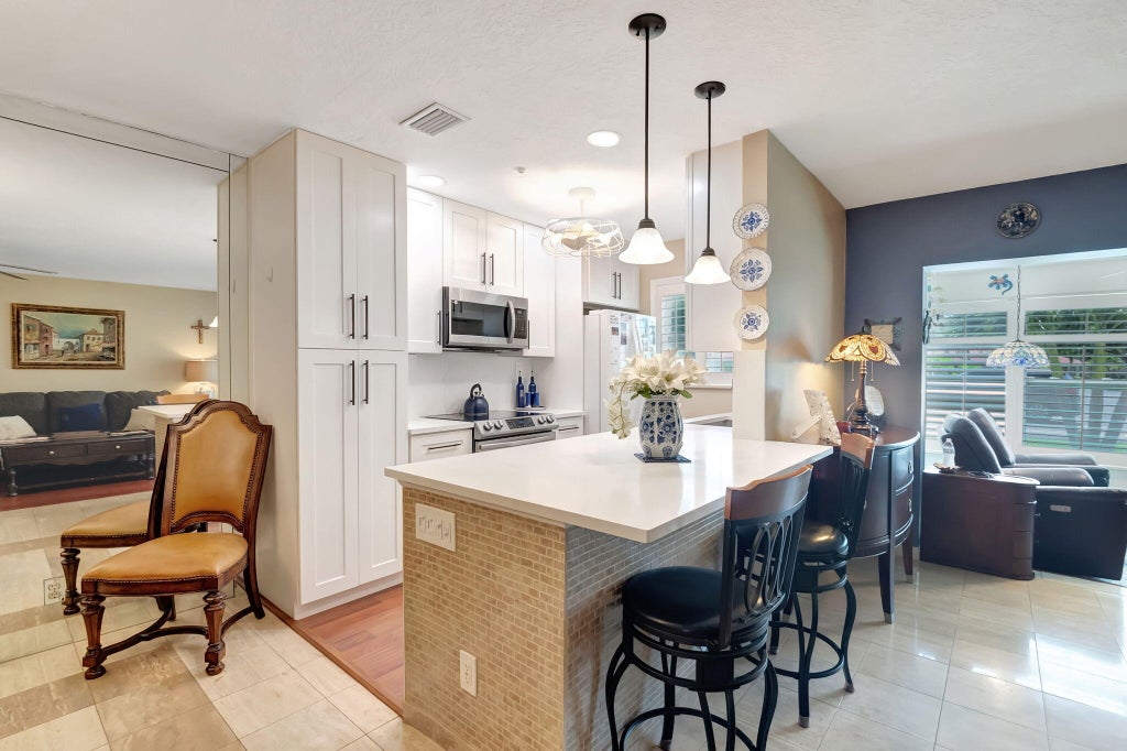 Pride of ownership is evident from the moment you enter into this completely remodeled 1BR/2 full bath villa. Villa Features: Newly remodeled open concept kitchen w/hardwood white cabinets, new pulls, pull out drawers, quartz counters new SS appliances, white refrigerator w/bottom loading freezer, New windows w/accordion shutters, interior plantation shutters on all windows, High Hat lighting, paddle fans in every room, Knock down ceilings in Living, dining and Florida room, popcorn only in MBR, Tile/marble and laminate flooring, newly installed extra closet in living room, 2 full bathrooms with new quartz vanities, sperate shower stall in guest BR and jacuzzi tub in Master BR. raised panel doors, entire villa was freshly painted w/accent walls