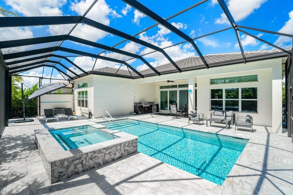 This magnificent Jade model with a heated pool and extended screened patio features 2,735 a/c square feet with 3 bedrooms, a den, 3.5 baths and a 3-car garage. Upgrade highlights include a whole house generator, Heated pool with salt water chlorination and a swimming current, an enormous screened patio with picture frame enclosure, a built in wall unit in the great room with electric fireplace, tons of LED lights, kitchen and bath upgrades, motorized shutters, gutters, custom closets, upgraded landscaping, a Tesla wall charger and so much more. Call for a full list of upgrades.