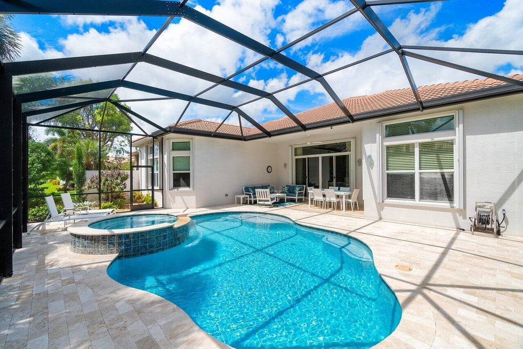 Welcome to your dream home! This exquisite Julia Model with a NEW POOL is located in the prestigious 55+ community of Valencia Reserve. It embodies the ultimate Florida lifestyle with every detail designed for comfort and elegance. Inside, the expansive triple-split floor plan offers 3 spacious bedrooms, an oversized great room, a formal open den, and a versatile bonus room, perfect for a home office or hobby space. The gourmet kitchen is a chef's paradise featuring endless granite countertops, pull-out shelves throughout, modern task lighting, a wall of pantry storage, and an eat-in kitchen table -- ideal for casual dining or entertaining. Step outside to your own private oasis...a newly installed saltwater pool, surrounded by a gorgeous travertine-tiled deck within a screened enclosure.
