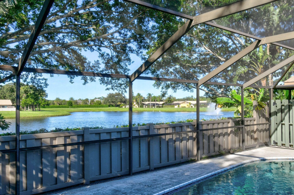 Welcome home to this lakefront 3-bedroom, 2-bath villa with a private pool in desirable Palm Beach Gardens. This one-level residence features soaring ceilings & offers pool & lake views from all newly-painted rooms. Highlights include a newer metal roof (2018), A/C (2021), tile flooring t/o, updated appliances & a new pool motor & pump. The primary bedroom boasts vaulted ceilings & sliders to the pool area. The spacious kitchen connects to the family room & the third bedroom, perfect for a den or office. Enjoy an enclosed pool w/ a privacy fence, & take advantage of Westwood Gardens' amenities: two pools, clubhouse, playground, and sports courts. Conveniently located near Alton Town Center, golf, great dining, shopping, beaches, and easy highway access. Don't miss this opportunity!