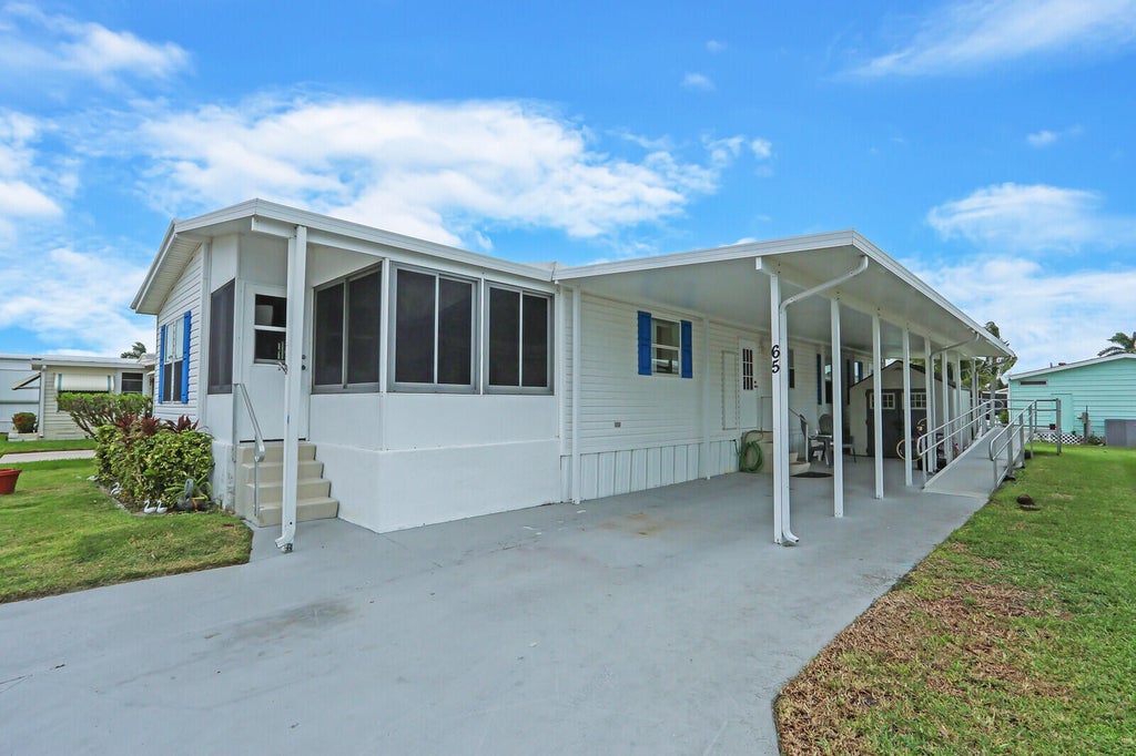 Welcome to Jupiter River Park where you own your land and are less than 1 mile to the beach that has been named the clearest water in the South! #65 is a large 2 bedroom, 2 bath, Jacobsen Chancellor model with high ceilings, separate laundry room, screened in front porch, storage shed and carport. The master suite includes an office/den enclosed with French doors, a master bath with dual vanity, jetted spa and separate shower and a large walk - in closet. Tile and laminate flooring throughout. In this lively 55+ community you're within minutes' walk to Dubois Park, Jupiter Beach and Inlet, Inlet Village restaurants, Par 3 golf, Maltz Theatre, Pickleball courts, Carlin Park, fishing, grocery stores and Jupiter's A1A bike path.