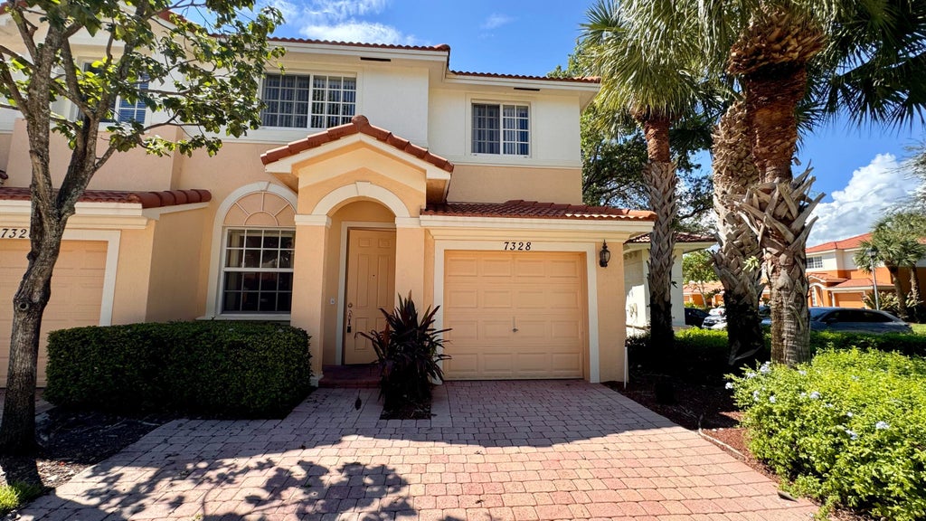 Beautiful corner unit featuring 3 bedrooms and 2.5 baths with a stunning lake view. The first floor boasts ceramic tiles throughout, enhancing the spacious living areas. The kitchen is equipped with granite countertops and stainless steel appliances. The master bedroom offers a large walk-in closet and an elegant en-suite bathroom with a Roman tub and separate shower. This unit includes a garage and is ready for immediate move-in.