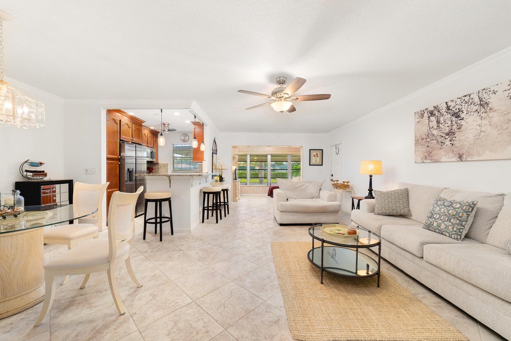Discover this charming, spacious villa ideally situated across from the clubhouse and pool. This 1-bedroom, 2-full-bath residence boasts a leveled floor Florida room under air, perfect for use as a den or potential second bedroom. Enjoy neutral tile flooring throughout, a recently remodeled open concept kitchen featuring granite counters and stainless steel appliances, a modern brand new primary bathroom and updated fans throughout. Experience the best of Florida living in this vibrant 55+ community offering an array of social activities, a large heated resort-style pool, and clubhouse amenities. Conveniently located near all essentials, including minutes to the beach and downtown Delray with its charming shops, cafes, fine dining, shopping centers, and theaters.