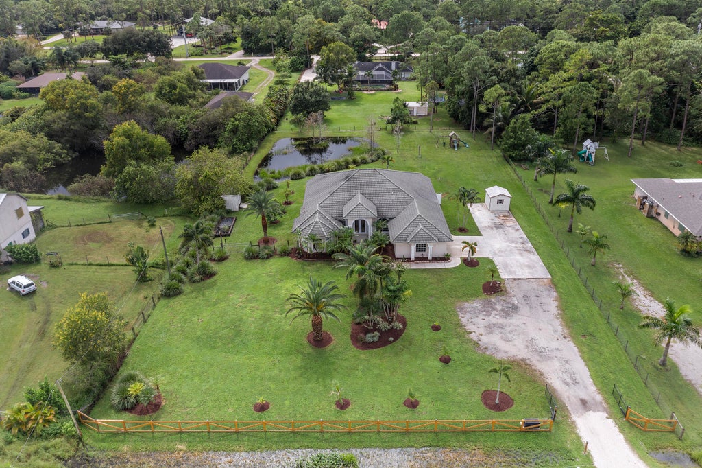 Step into this first-time-on-the-market, custom-built home in the heart of Jupiter Farms. Designed to impress, this 4-bedroom, 3-bathroom residence with a private office is set on an expansive 1.3-acre lot, offering the perfect blend of privacy, space, and luxury. As you pass through the secure keypad-entry gate, you'll immediately notice the home's elevated position, offering a sense of privacy and distinction from the neighboring properties. Step inside to be greeted by 11' ceilings, intricate crown molding, and subtle ambient up-lighting that together create an atmosphere of sophistication, while large windows fill the space with natural light.