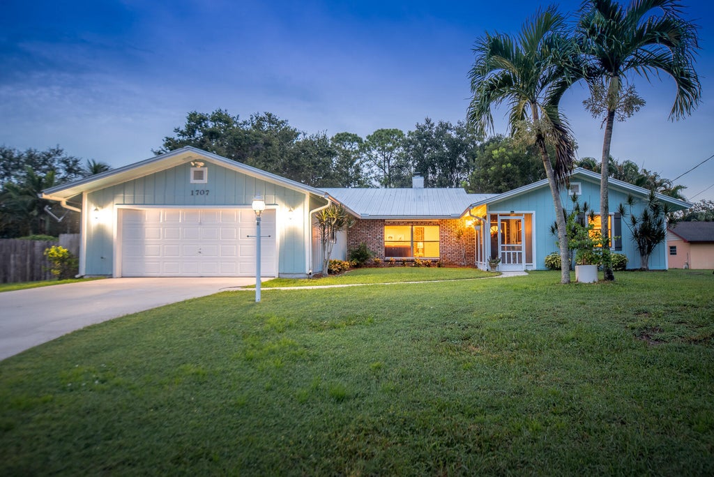 This beautiful 3-bedroom, 2.5-bath home in Stuart sits on a spacious half-acre lot, offering both privacy and convenience. The home features a 2021 metal roof, luxury vinyl flooring, and charming details like a shiplap accent wall and a cozy wood-burning fireplace. The expansive kitchen is a chef's delight, with granite countertops, a subway tile backsplash, and a gas stove. The master suite is a true retreat, with direct patio access and a beautifully updated master bath. The large backyard includes an open patio, a shed, and plenty of room to add a pool. Located close to A-rated schools, parks, campgrounds, boat ramps, and more, this property has it all!