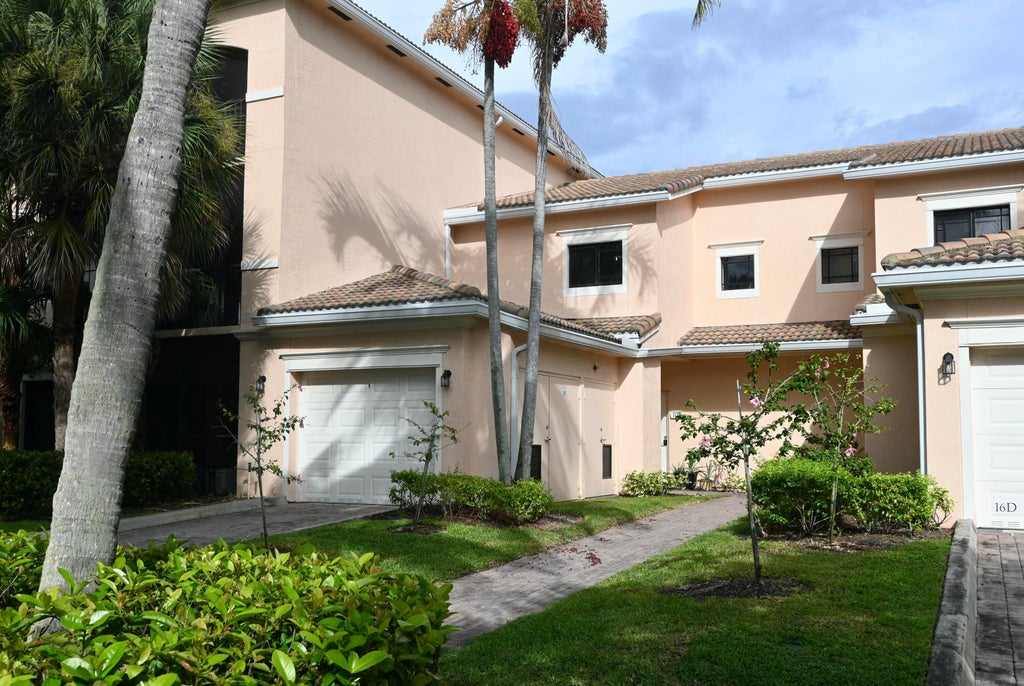 Come home to luxury living in gated San Matera. Spacious two-story 3/3 townhome, one car garage. Fit 2 cars on DW. Immaculate condition. Updated kitchen, new fixtures, flooring. Freshly painted. New roof 2021; New A/C Nov 2022. Full size stacked Washer and Dryer, pantry closet.One BR, full bath on main level, two en-suite Master BRs upstairs, small open loft area. Hurricane shutters for downstairs windows. Valet trash. Amenities! Walk to Clubhouse, Party Room, Game Room, Card Room. Large resort-style pool with outdoor spa and ample seating. Fitness center includes weights, treadmills, racket ball, basketball. Tennis/pickle ball courts. Convenient to shopping/dining at the Gardens Mall and Downtown at the Gardens. 5 miles to sandy beaches/Atlantic coast.