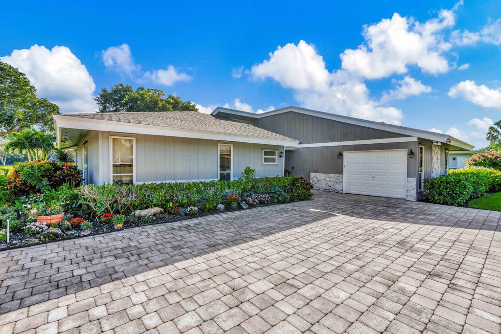 This stunning home boasts a bright and expansive great room with soaring volume ceilings, seamlessly connecting the living room, dining area, and kitchen, all the while offering breathtaking views of the golf course. Recently updated, the home features large porcelain floors throughout. The kitchen, designed for entertaining, includes beautiful white wood cabinets, quartz countertops, and an oversized center island that serves as a welcoming space for guests. The large primary bedroom offers two walk-in closets with built-in shelving, a double vanity, and an oversized shower. The home also includes two spacious guest bedrooms each with its own full bath, a bar area, a roomy garage with beautiful new flooring, and a separate golf cart garage at the back. A new roof was installed in 2022.
