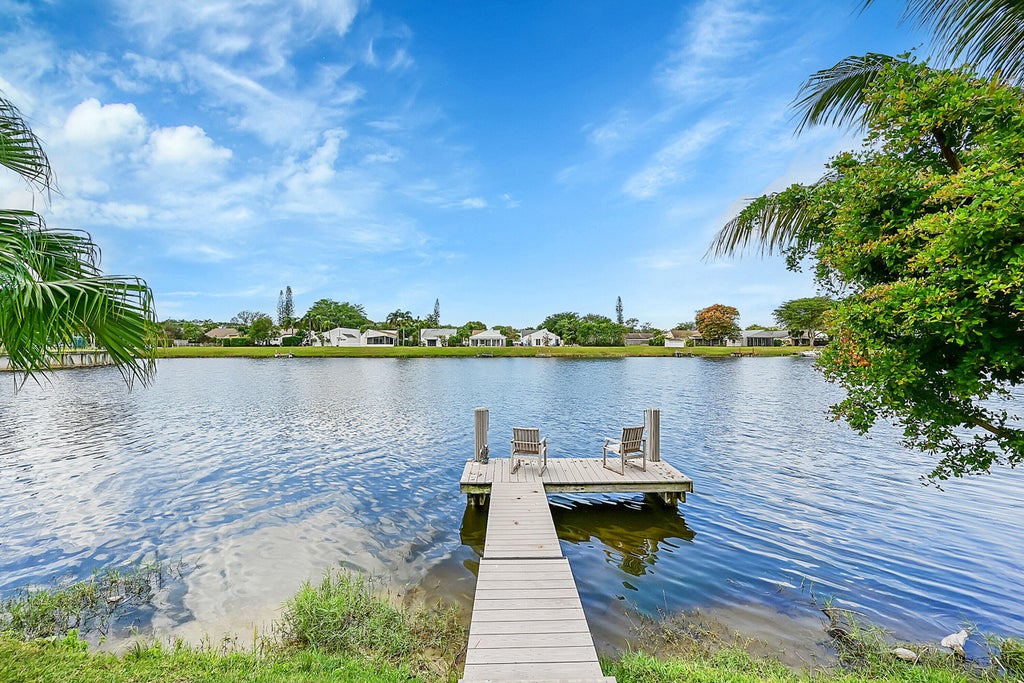 This charming 2-bedroom, 2-bath home with a 1-car garage for ALL AGES offers serene lakefront living in a gated community. Bring your boat to traverse the lake which leads to Lake Ida. Peaceful lake views & sunsets from your PRIVATE DOCK and enclosed patio. The home has been freshly painted, and both baths are beautifully updated, with tile throughout. Features include impact windows and accordion shutters for added security. The chef's kitchen is a standout, with stainless steel appliances, granite countertops, and ample space for cooking and entertaining. A wet bar with wine frig in the living room enhances the home's entertainment options. Located in an all-ages gated community with a pool and tennis courts, and just 3 miles from the beach.