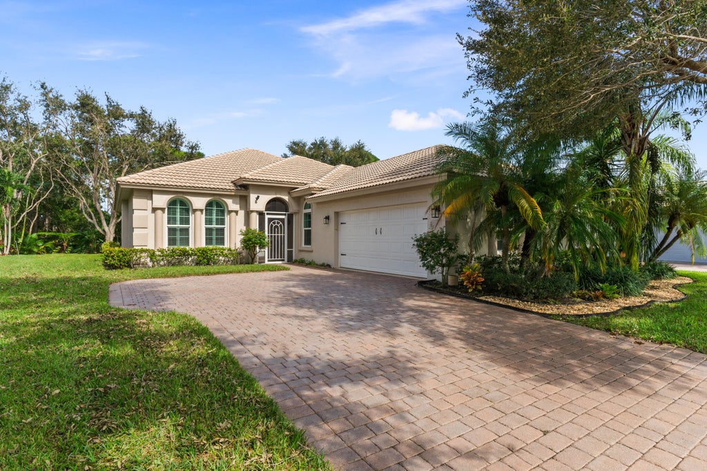 2003 CBS 2Bed +office 2Bath 2Car Garage Diana Model in Jensen Beach Country Club. Located on preserve lot backing up to the 15th tee box. This home has been updated with impact windows. Accordion hurricane shutters on the porch. Kitchen features 42'' gray cabinets, 3CM Quartz counters, Stainless Steel appliances, high hat lighting, tile backsplash, breakfast bar & eat in kitchen with bay view window. Family room has 12' high ceilings, double tray ceiling, pocket sliders to extended screen porch with epoxy floors. Spacious master suite offers double tray ceilings, 2 walk-in closets, dual sinks, makeup vanity, separate shower & tub. 2nd bedroom & office have plantation shutters. Utility room Washer, dryer & sink. Side entry Garage has epoxy flooring. Water Heater 2020, A/C 2018, Roof 2003.