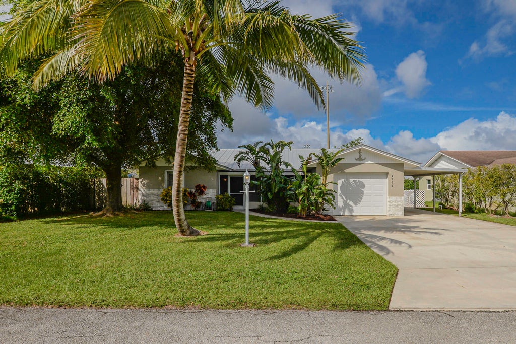This beautifully maintained, 3-bedroom, 2-bathroom, pool home, is just waiting to be yours. As you step into the open concept living space, looking out over the pool to the spacious fence in back yard, dream of the fun you will have out there. Maybe sitting under the mango tree after a cool dip in the pool. Inside, do not overlook the beautiful u-shaped kitchen, white cabinets, granite counters, breakfast bar and a brand-new range. While you continue looking at the 2 bedrooms and guest bath and most importantly the primary suite with a custom closets, picture the layout for you. Finally, end with the 1 car garage and carport for your vehicles and toys. Live close to beaches, restaurants, shopping, and medical. Martin county taxes and schools. Is this your place to call home?