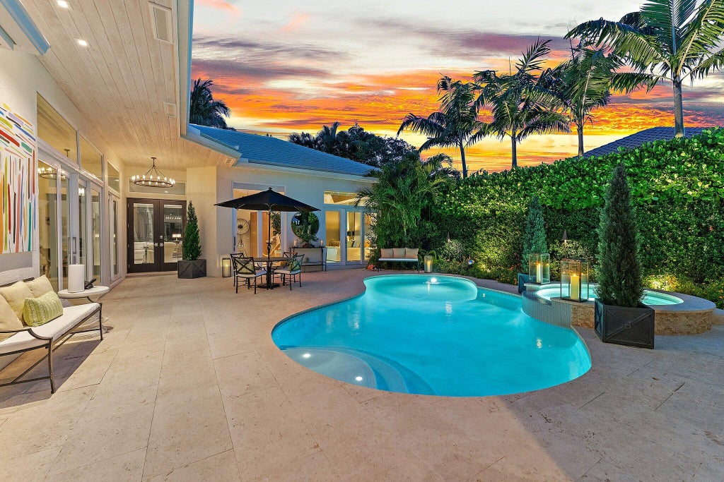 Experience this true gem of a home exuding serenity and tranquility bringing the outside in, in the desirable community of Ballenisles. 3 Bedroom, 3 Bath home including 2 bedrooms plus a den/office in the main house plus a one bedroom guest cottage, which sits looking out on the impressive courtyard & pool with organic 18 by 36 inch Coral stone decking. The home lives large as all rooms look out onto the 1700 square foot courtyard. Exquisite upscale, luxury upgrades and finishes throughout. You will be impressed by the modern, well crafted finishes displayed along with neutral and appealing decor which makes it easy to be able to add your very own touches to this jewel. The flooring is beautifully kept Travertine Marble in the majority of the living area which once again is looking out