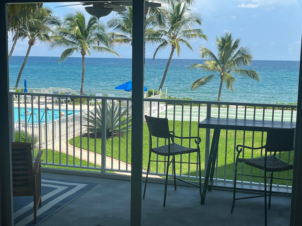 Glorious Direct Ocean View awaits you in desirable Highland Beach! Watch the sunrise every morning from the comforts of the private balcony. Moonrises are just as appealing. Relax in your own personal piece of paradise while listening to the ocean waves and watching the beautiful ships sail across the horizon. This renovated 2/2 split floor plan features an open kitchen, renovated bathrooms with step-in showers and an expanded living room. This amazing oceanfront furnished condo is turnkey with everything you will need. Elevator, community room, daily happy hour, fitness area, shuffle board, ping pong and billiards, and cable TV. This condo is comfortably located near Downtown Delray Beach, the fun and exciting Atlantic Avenue, the Delray Sands Resort, fine dining and shopping at Mizner