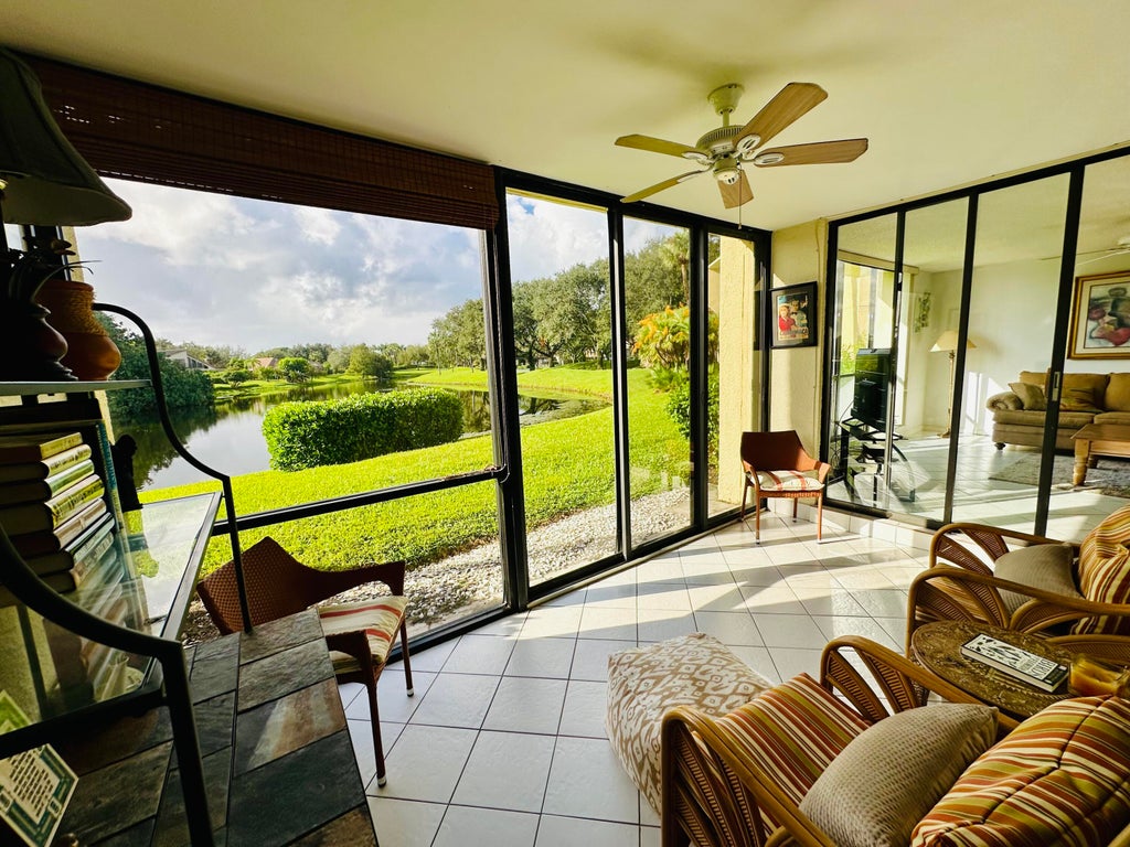 Charming furnished condo with 2 Primary Suites overlooking scenic pond in the desirable 55 and older community of Woodland Lakes. Beautiful granite counters compliment the bright white cabinetry. Split bedroom layout provides ample privacy. Relax with your morning coffee on your private porch enclosed with slider doors. Enjoy cooling off in the community pool or taking a stroll through the quiet community. Great location, close to some of the best shopping, dining, 95 and PBI airport.All measurements are approximate.