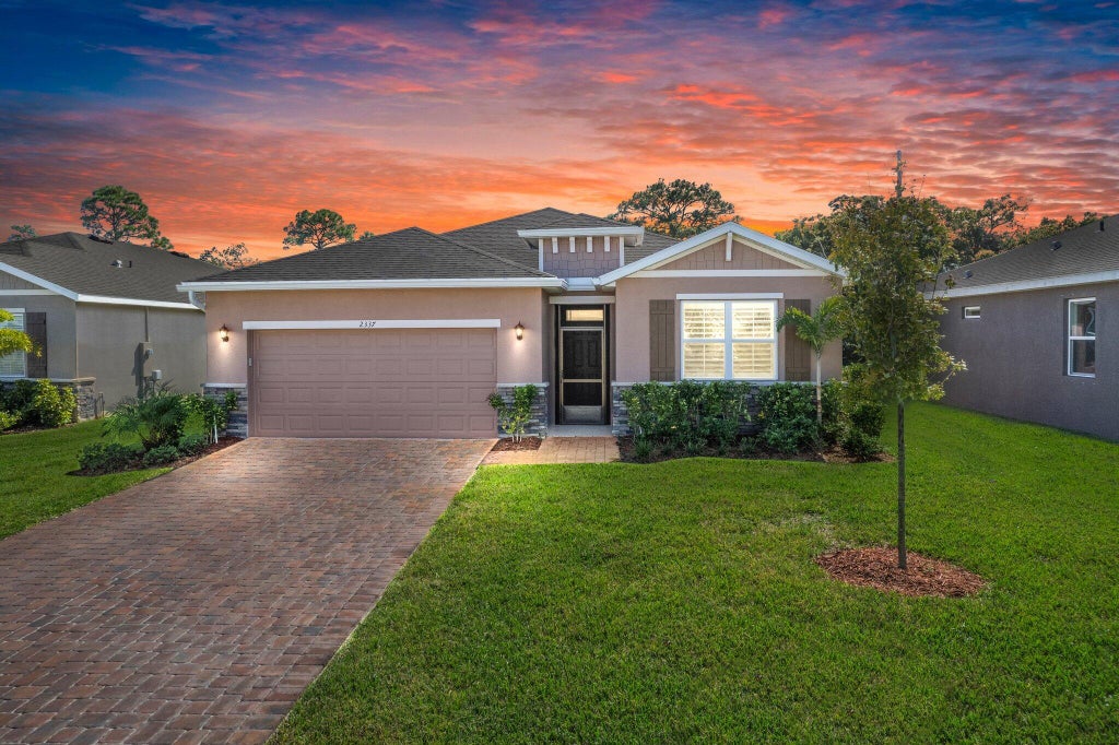 Cove at Falcon Trace! Almost NEW CONSTRUCTION 2023 quality built DR Horton Delray Model 2060 sq ft, 4 Bed, 2 Bath, 2 Car GA w/paver driveway. Immaculately kept! Upgraded kitchen w/ cabinets & granite w/ breakfast bar opens to the lvg room. All windows have new plantation shutters w/ sliding plantation shutters for patio doors! Privacy and light fortress.Split bedroom floor plan w/ all new ceiling fans. Screened in front and back patio & new gutters. Supreme private .23 Acre lot backing up to nature preserve. Lawn care incld in low HOA of $200/mth! Beautiful community resort style pool.