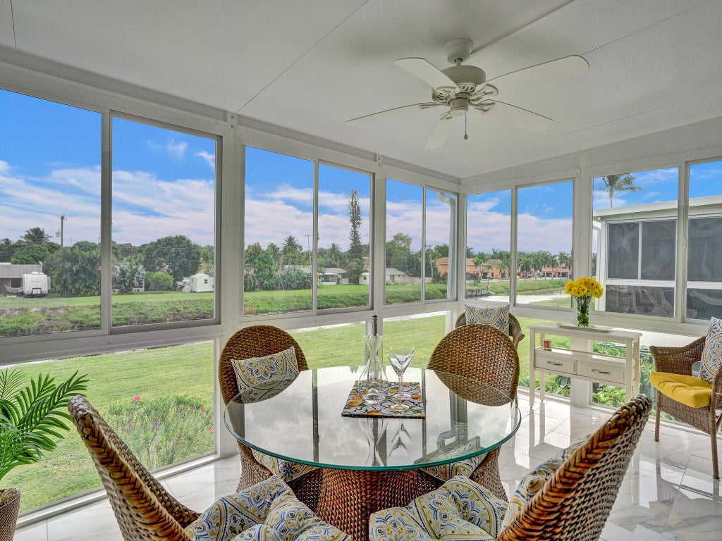 PINES OF DELRAY. Turnkey furnished and move-in ready, this outstanding 2/2 condo offers all impact windows inside, 5.5'' tall baseboards, contemporary wall colors and large-tile throughout. There's also a re-built 16' x 10' SCREENED PATIO with 5 sets of 48 inch tall slider windows, 12'' x 24'' Cesari Bianca II polished porcelain tile with an idyllic eastern exposure overlooking a wide greenbelt backyard and a navigable canal. The 17 foot long eat-in kitchen boasts a Yorkville Hanstone quartz countertop, Montage Clarity Stone glass mosaic backsplash, 9 inch deep 18 gauge stainless steel sink, full size LG washing machine(4 cubic foot capacity)and dryer and recessed lighting. And there's also a Rheem 2-ton/14.5 seer ac system .